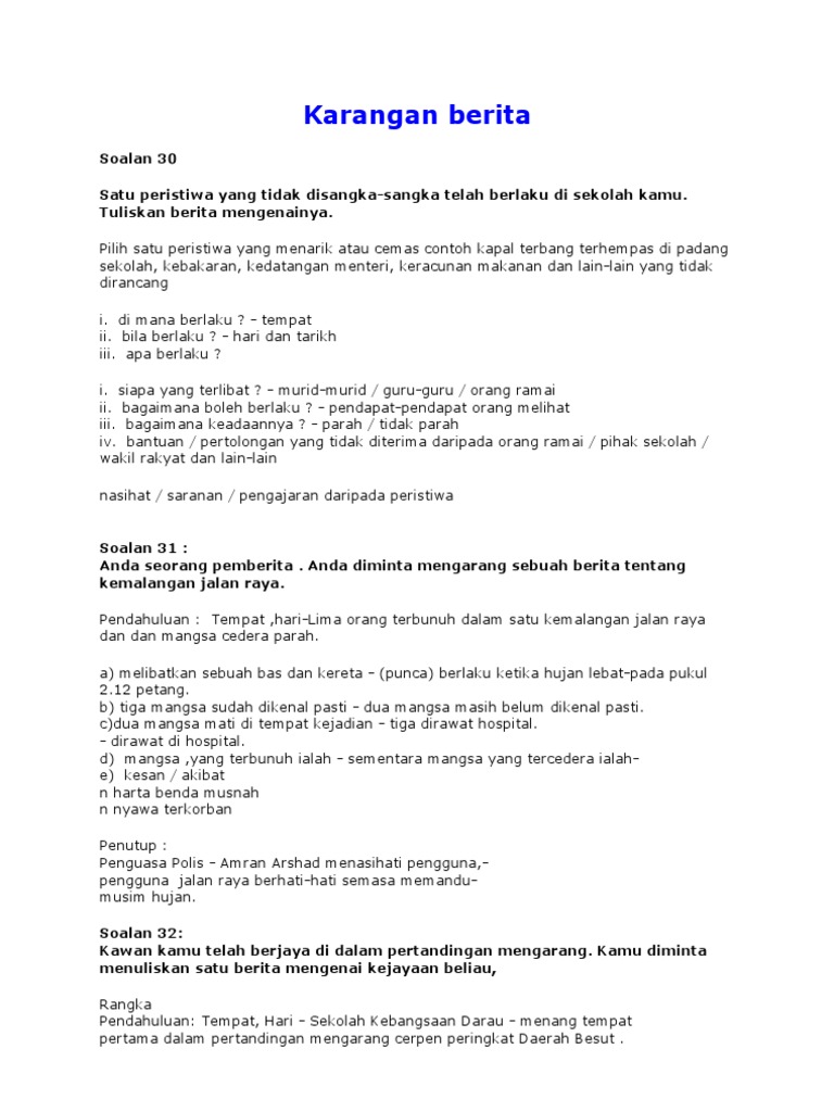 Contoh Karangan Berita Upsr Temblor En Cute766 from cdn10.cute766.info Karangan bergambar tunggal • karangan yang hendak ditulis itu hendaklah berpandukan gambar yang tel ah disediakan. Kalimat yang meyakinkan pembaca tentang suatu pendapat penulis. Kami diminta menulis sebuah berita tentang kemalangan jalan raya. Kemalangan jalan raya sering berlaku di negara kita. Sebagai contohnya, para pemandu diwajibkan menduduki peperiksaan setiap dua tahun untuk menyegarkan ingatan dan membiasakan mereka. Bersama kita jadikan jalan raya kita jalan yang selamat. Kemalangan jalan raya ialah peristiwa ngeri yang biasanya melibatkan perlanggaran dua kenderaan atau lebih di jalan raya atau pun lebuh raya. Sejak kebelakangan ini, kadar kemalangan jalan raya semakin meningkat.